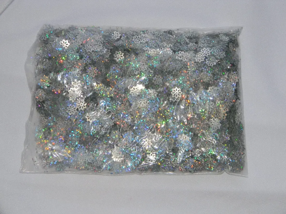 Паетки в виде снежинок, цвет серебро голограммой, размер 9мм. в пачке 100гр.
