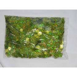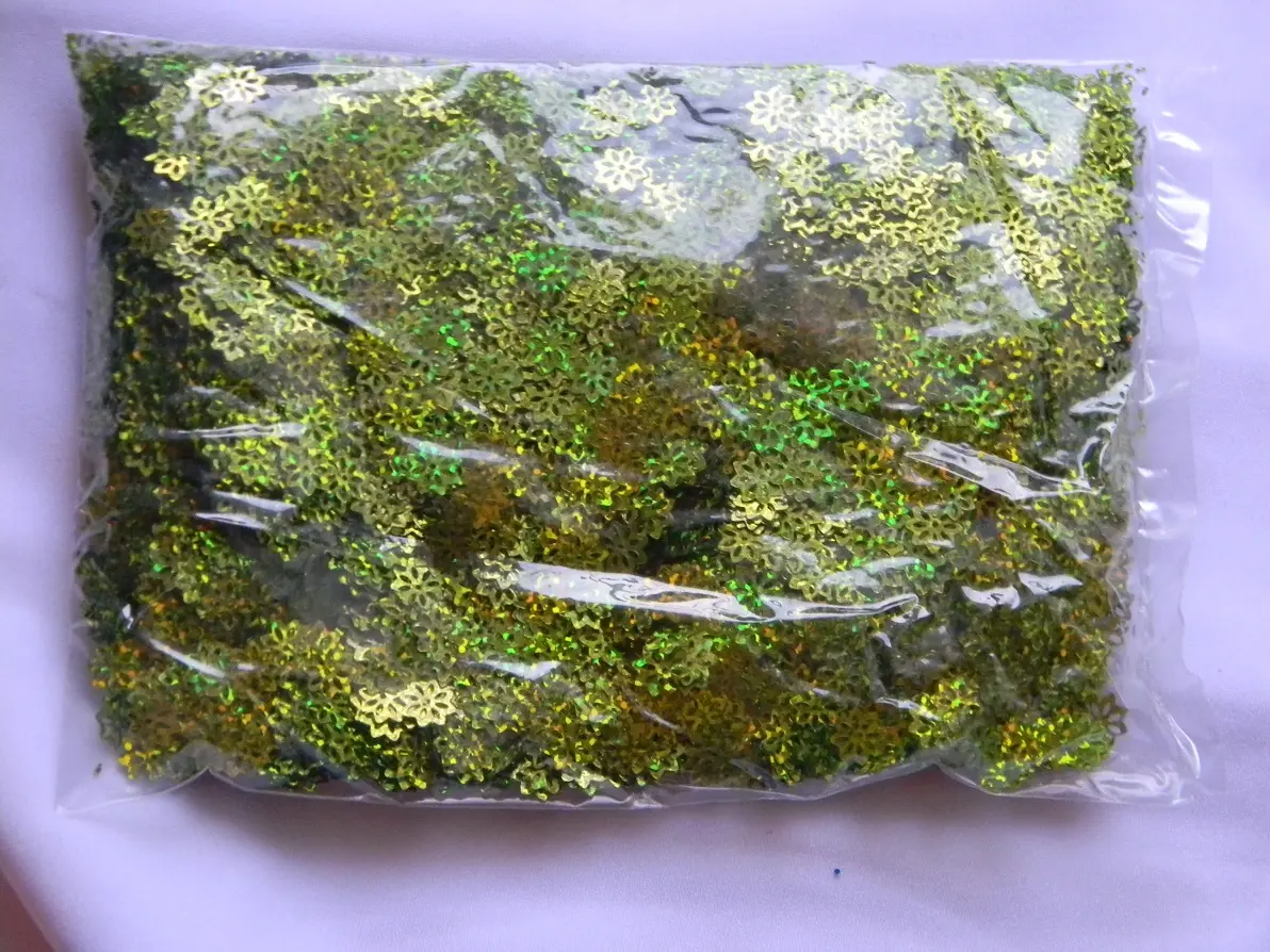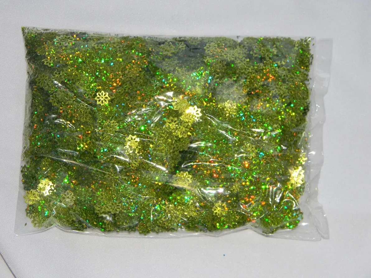 Паетки в виде снежинок, зеленые голограммой, размер 9мм. в пачке 100гр.