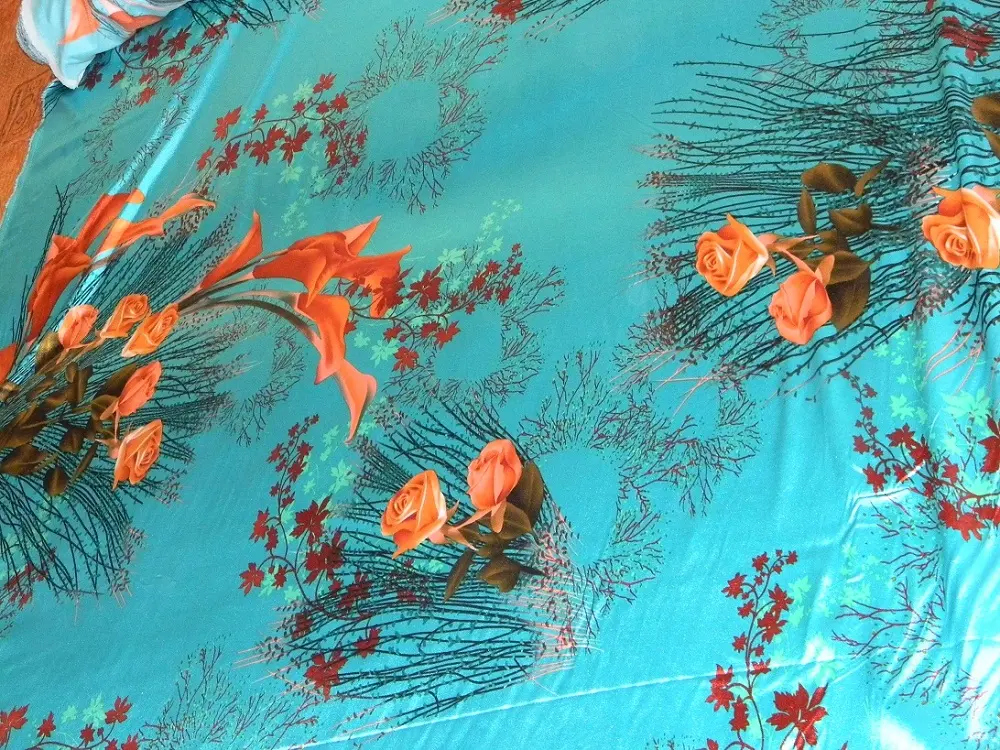 Атлас стрейч- набивной, на бирюзовом(цвет морской волны) поле цветы, тонкий, ширина 150см.
