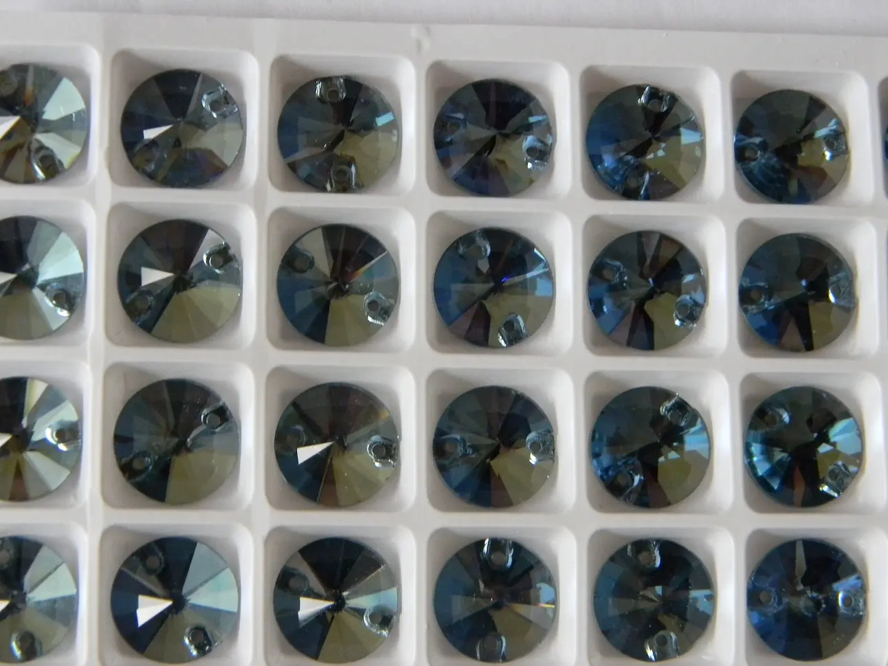 Риволи из стекла, цвет лайт сапфир, размер 14мм. с 2 отверстиями для пришивания. Китай.(пачкой 15р. за шт.. в пачке 112шт.)